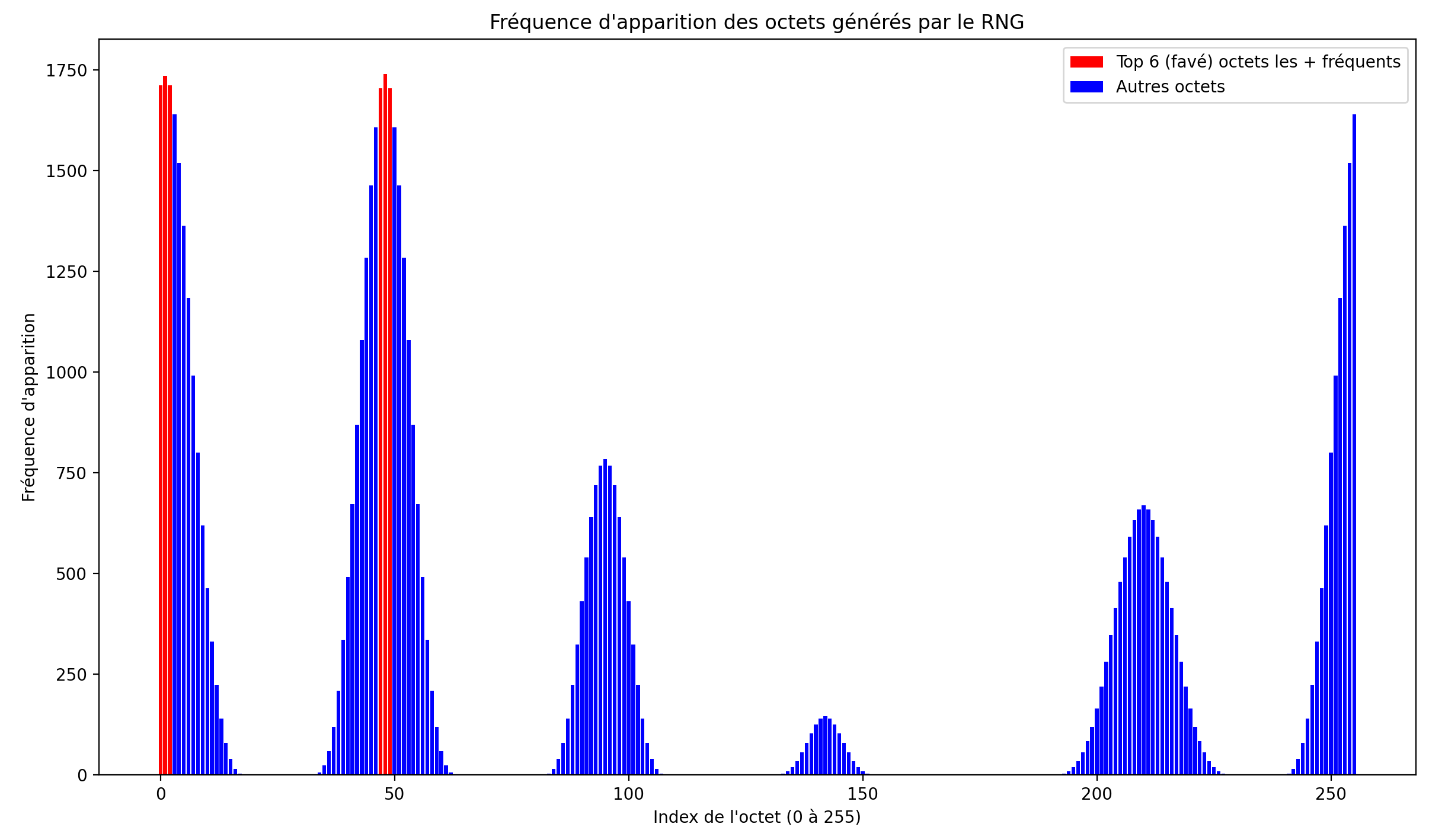 Voici une image illustrant la proportion d’apparition des octets générés par ce RNG :
